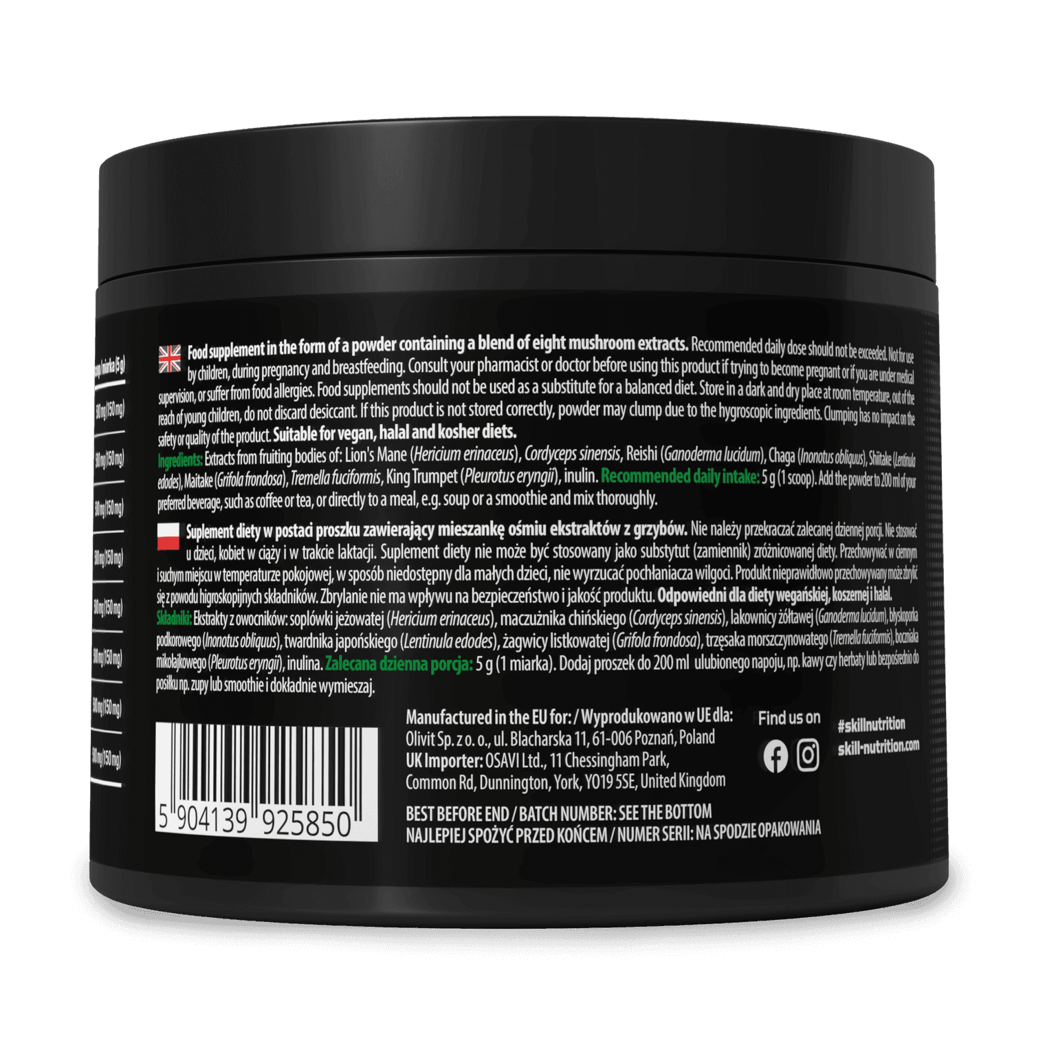 Food supplement in the form of a powder containing a blend of eight mushroom extracts. Recommended daily dose should not be exceeded. Not for use by children, during pregnancy and breastfeeding. Consult your pharmacist or doctor before using this product if trying to become pregnant or if you are under medical supervision, or suffer from food allergies. Food supplements should not be used as a substitute for a balanced diet. Store in a dark and dry place at room temperature, out of the reach of young children, do not discard desiccant. If this product is not stored correctly, powder may clump due to the hygroscopic ingredients. Clumping has no impact on the safety or quality of the product.