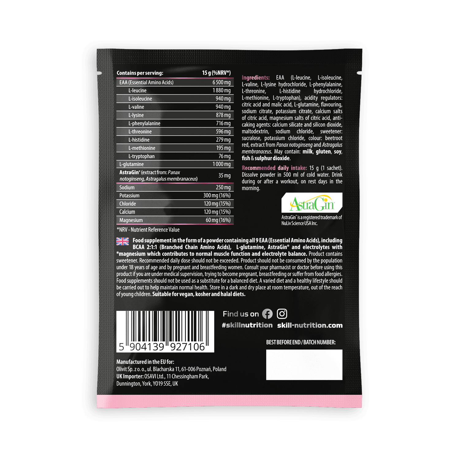 Food supplement in the form of a powder containing all 9 EAA (Essential Amino Acids), including BCAA 2:1:1 (Branched Chain Amino Acids), L-glutamine, AstraGin® and electrolytes with *magnesium which contributes to normal muscle function and electrolyte balance. Product contains sweetener. Recommended daily dose should not be exceeded. Product should not be consumed by the population under 18 years of age and by pregnant and breastfeeding women. Consult your pharmacist or doctor before using this product if you are under medical supervision, trying to become pregnant, breastfeeding or suffer from food allergies. Food supplements should not be used as a substitute for a balanced diet. A varied diet and a healthy lifestyle should be carried out to help maintain normal health. Store in a dark and dry place at room temperature, out of the reach of young children. Use within 2 months after opening. Contains a desiccant pack, do not eat. Natural clumping may occur; does not affect safety or quality.