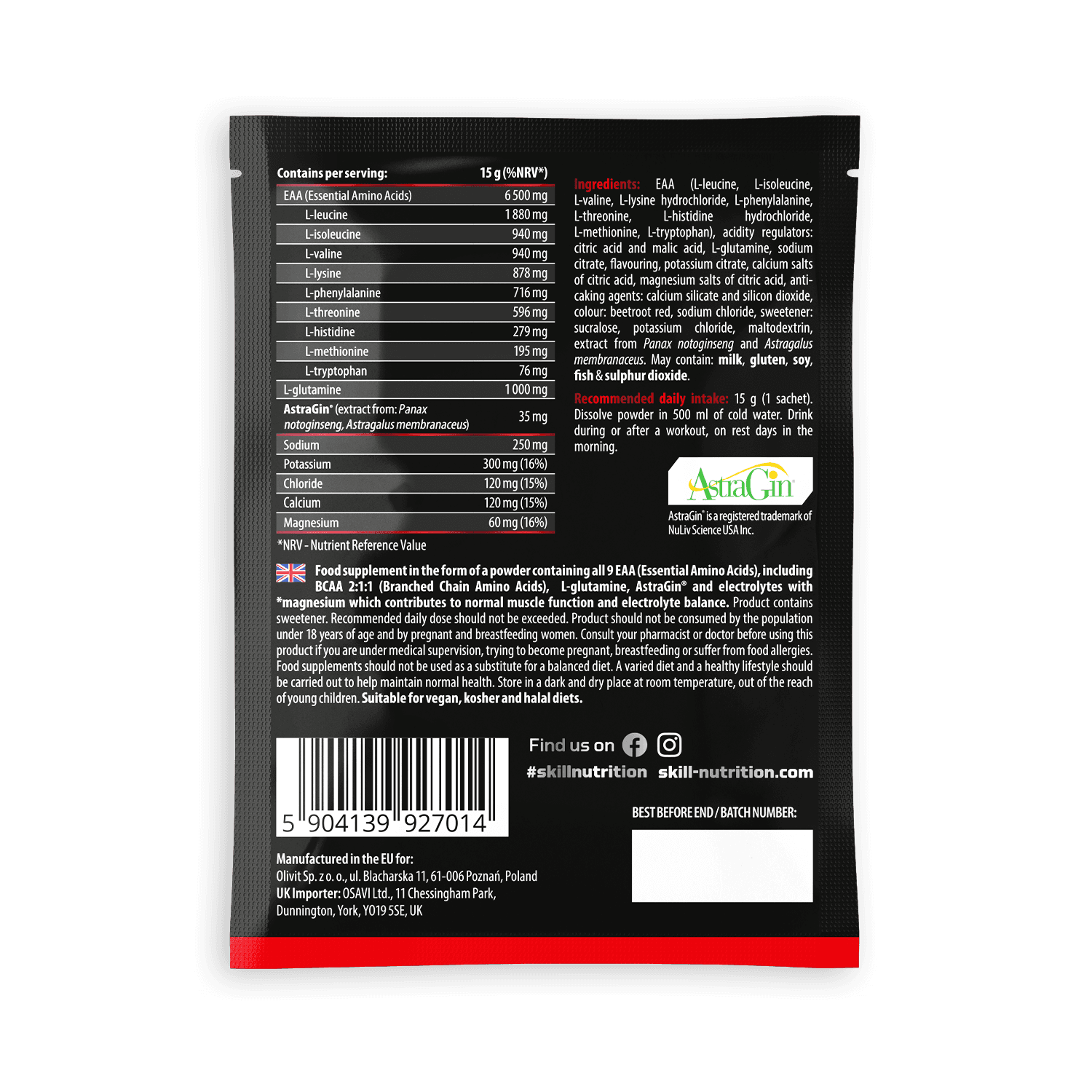 Food supplement in the form of a powder containing all 9 EAA (Essential Amino Acids), including BCAA 2:1:1 (Branched Chain Amino Acids), L-glutamine, AstraGin® and electrolytes with *magnesium which contributes to normal muscle function and electrolyte balance. Product contains sweetener. Recommended daily dose should not be exceeded. Product should not be consumed by the population under 18 years of age and by pregnant and breastfeeding women. Consult your pharmacist or doctor before using this product if you are under medical supervision, trying to become pregnant, breastfeeding or suffer from food allergies. Food supplements should not be used as a substitute for a balanced diet. A varied diet and a healthy lifestyle should be carried out to help maintain normal health. Store in a dark and dry place at room temperature, out of the reach of young children. Use within 2 months after opening. Contains a desiccant pack, do not eat. Natural clumping may occur; does not affect safety or quality.