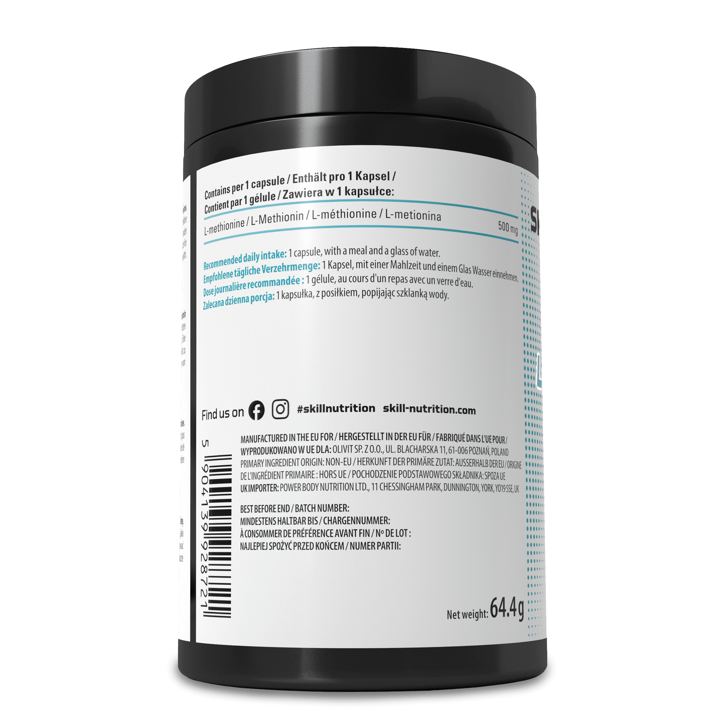 Food supplement in the form of a hard capsule containing the amino acid L-methionine. Recommended daily dose should not be exceeded. Consult your pharmacist or doctor before using this product if trying to become pregnant, during pregnancy, breastfeeding or if you are under medical supervision, or suffer from food allergies. Food supplements should not be used as a substitute for a balanced diet. A varied diet and a healthy lifestyle should be carried out to help maintain normal health. Store in a dark and dry place at room temperature, out of the reach of young children.