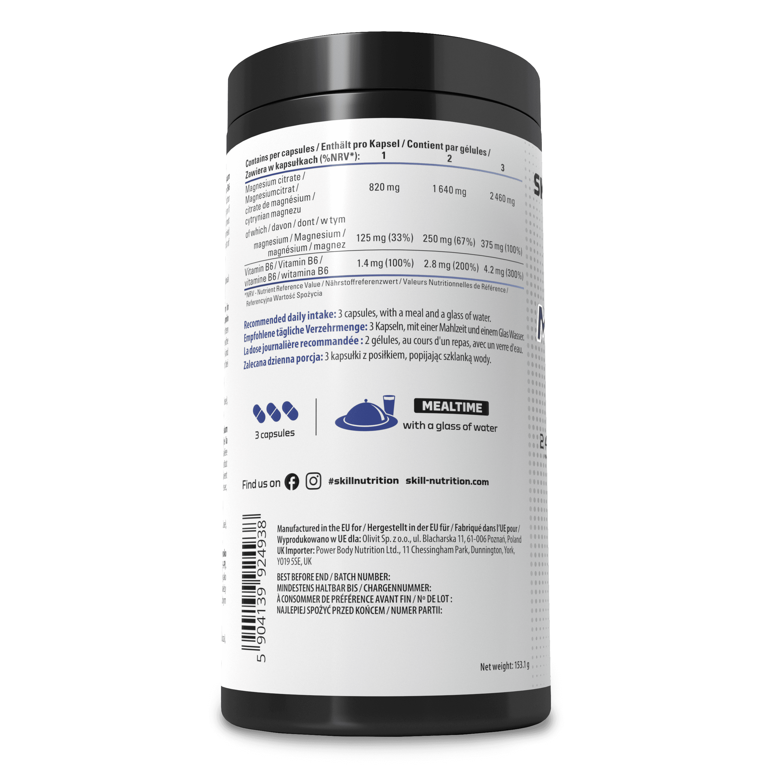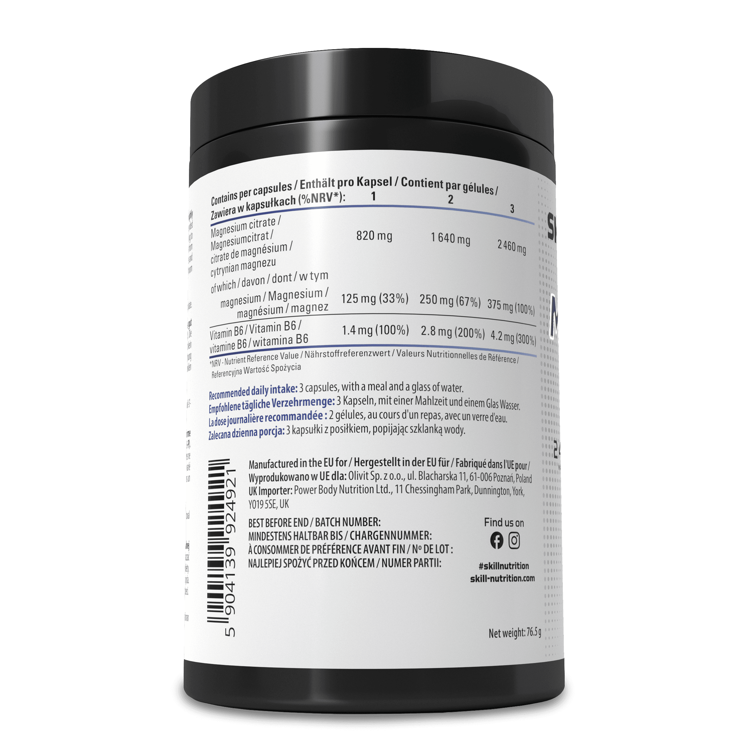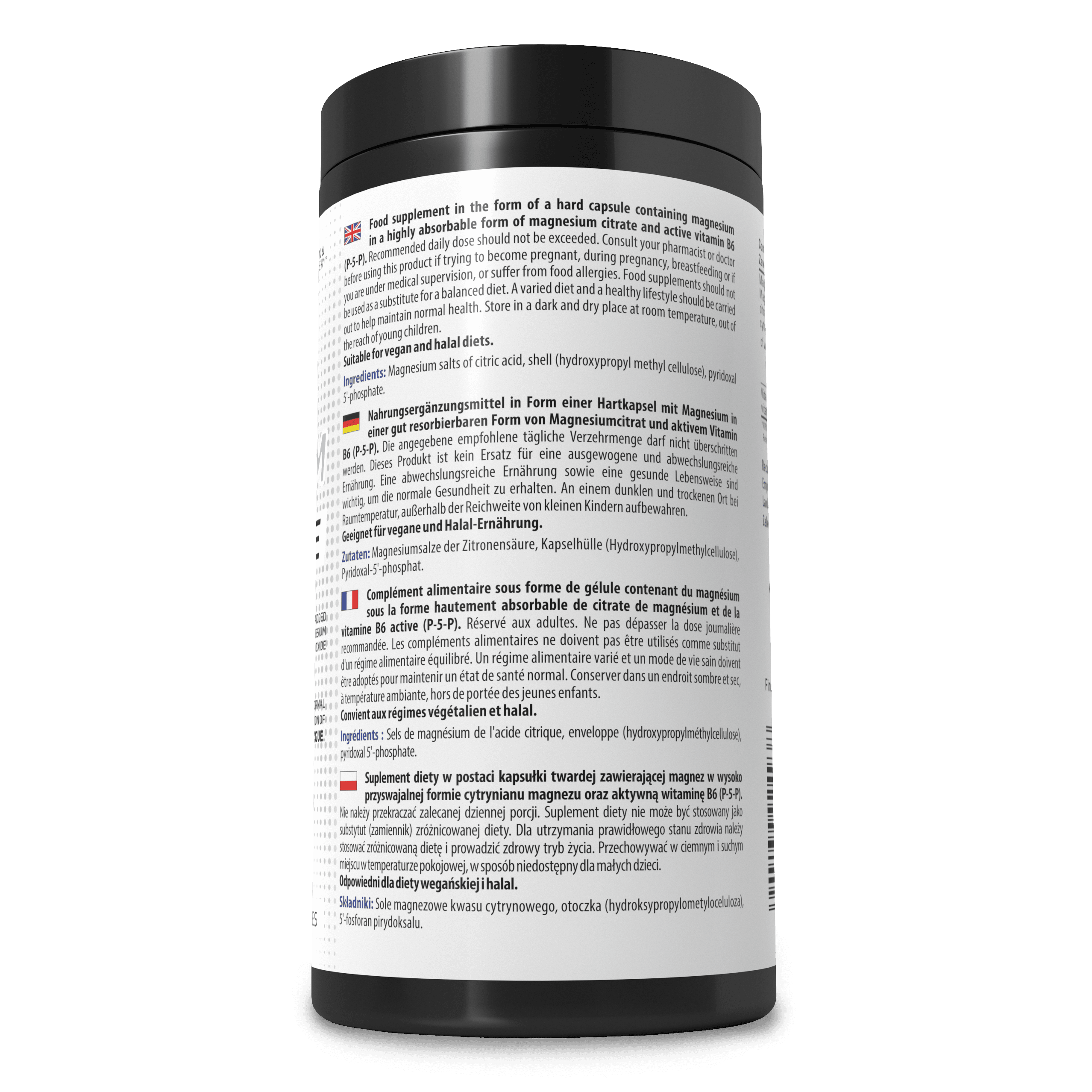 Food supplement in the form of a hard capsule containing magnesium in a highly absorbable form of magnesium citrate and active vitamin B6 (P-5-P). Recommended daily dose should not be exceeded. Consult your pharmacist or doctor before using this product if trying to become pregnant, during pregnancy, breastfeeding or if you are under medical supervision, or suffer from food allergies. Food supplements should not be used as a substitute for a balanced diet. A varied diet and a healthy lifestyle should be carried out to help maintain normal health. Store in a dark and dry place at room temperature, out of the reach of young children.
