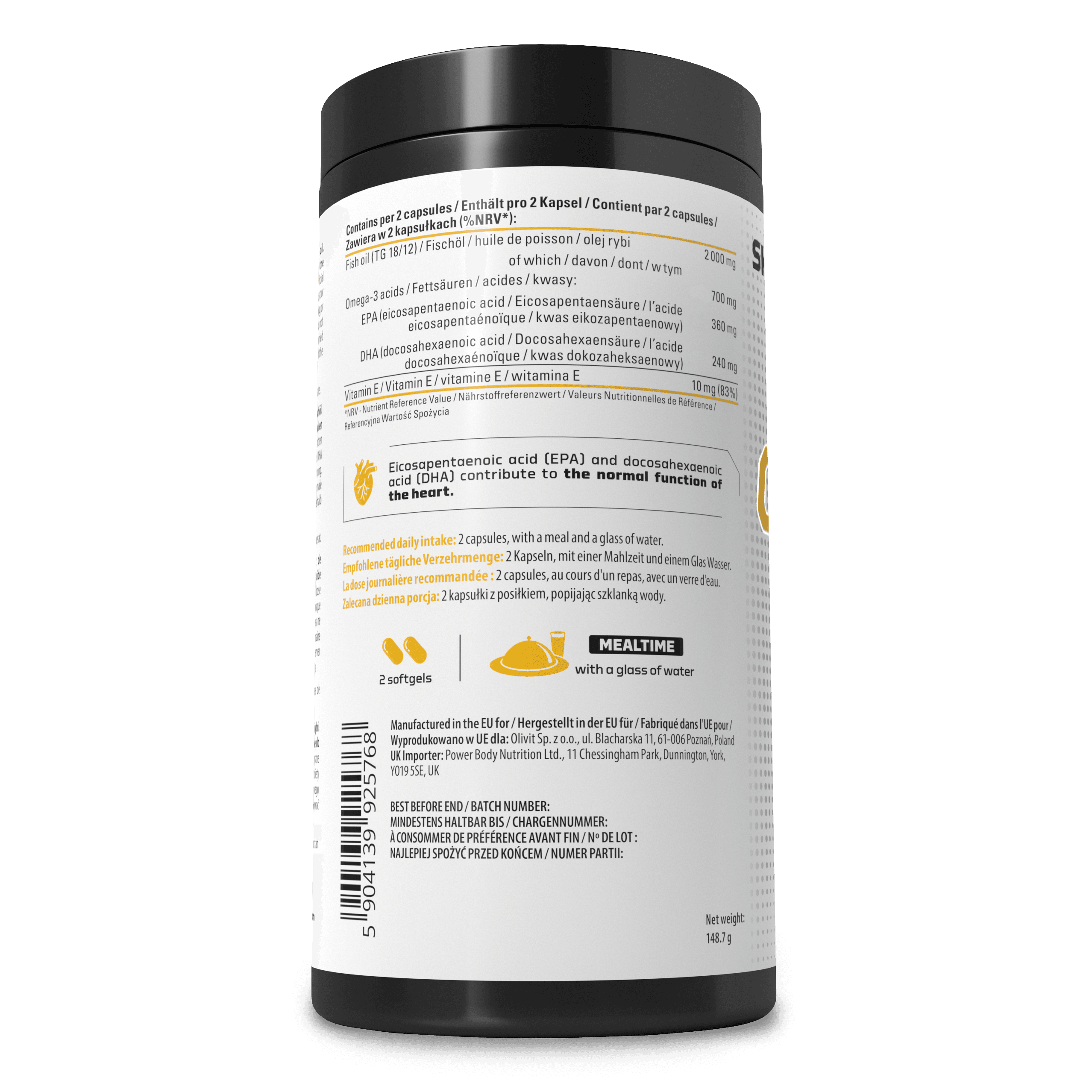 Food supplement in the form of softgels containing concentrated fish oil. Eicosapentaenoic acid (EPA) and docosahexaenoic acid (DHA) contribute to the normal function of the heart. Recommended daily dose should not be exceeded. The beneficial effect is obtained with a daily intake of 250 milligrams of EPA and DHA. Consult your pharmacist or doctor before using this product if trying to become pregnant, during pregnancy, breastfeeding or if you are under medical supervision, or suffer from food allergies. Food supplements should not be used as a substitute for a balanced diet. A varied diet and a healthy lifestyle should be carried out to help maintain normal health. Store in a dark and dry place at room temperature, out of the reach of young children.