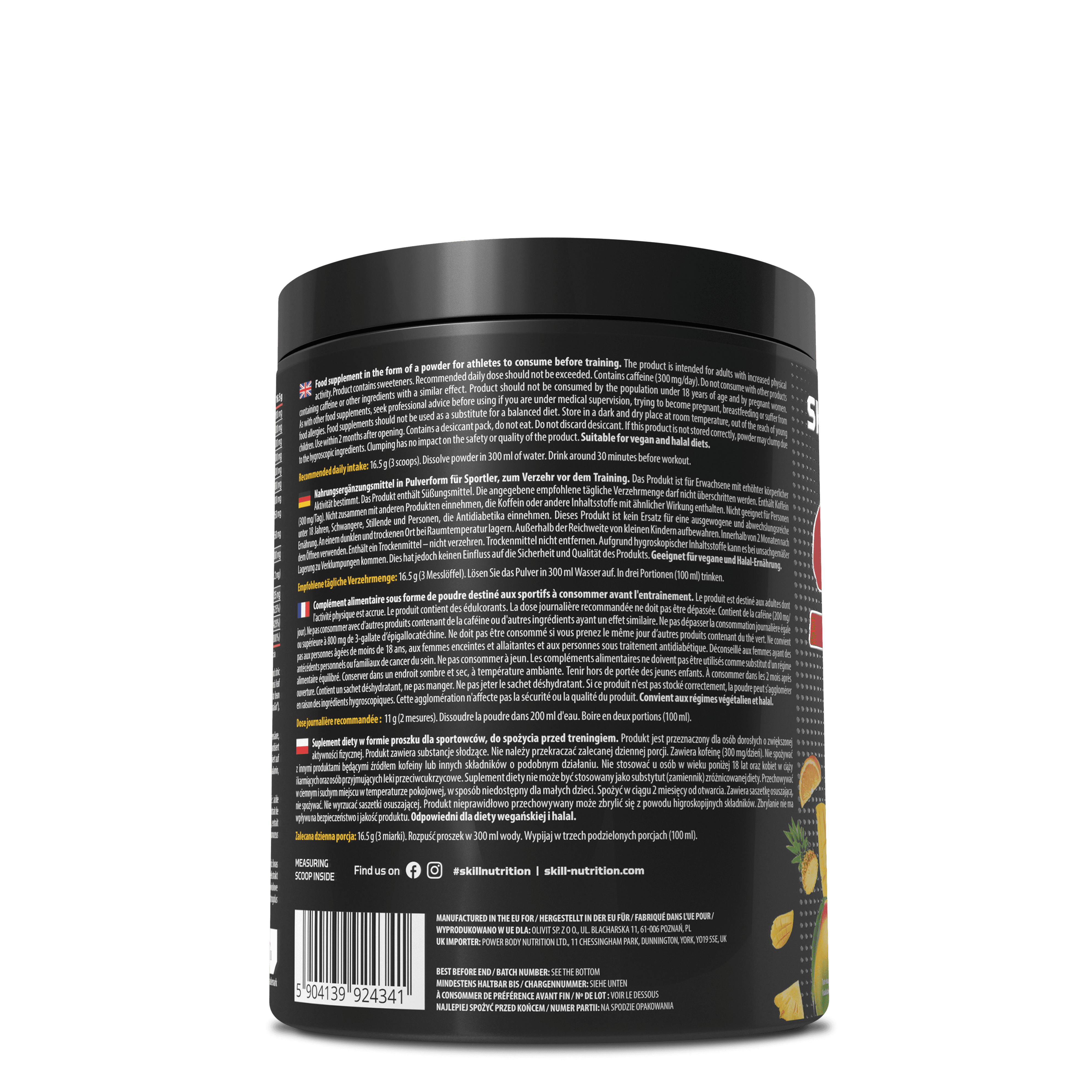 Food supplement in the form of a powder for athletes to consume before training. The product is intended for adults with increased physical activity. Product contains sweeteners. Recommended daily dose should not be exceeded. Contains caffeine (300 mg/day). Do not consume with other products containing caffeine or other ingredients with a similar effect. Product should not be consumed by the population under 18 years of age and by pregnant women. As with other food supplements, seek professional advice before using if you are under medical supervision, trying to become pregnant, breastfeeding or suffer from food allergies. Food supplements should not be used as a substitute for a balanced diet. Store in a dark and dry place at room temperature, out of the reach of young children. Natural clumping may occur; does not affect safety or quality.