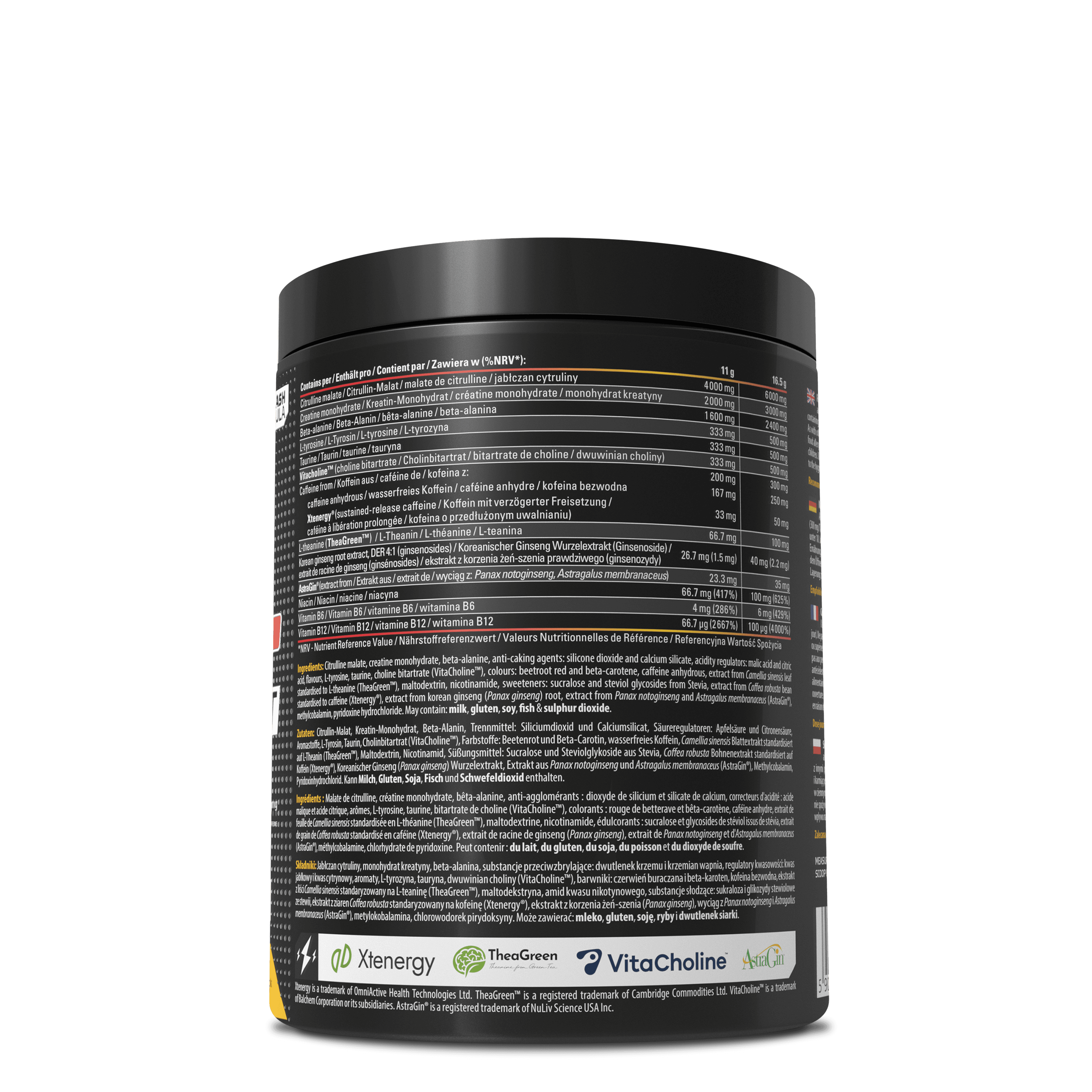 Citrulline malate, creatine monohydrate, beta-alanine, anti-caking agents: silicone dioxide and calcium silicate, acidity regulators: malic acid and citric acid, flavours, L-tyrosine, taurine, choline bitartrate (VitaCholine™), colours: beetroot red and beta-carotene, caffeine anhydrous, extract from Camellia sinensis leaf standardised to L-theanine (TheaGreen™), maltodextrin, nicotinamide, sweeteners: sucralose and steviol glycosides from Stevia, extract from Coffea robusta bean standardised to caffeine (Xtenergy®), extract from korean ginseng (Panax ginseng) root, extract from Panax notoginseng and Astragalus membranaceus (AstraGin®), methylcobalamin, pyridoxine hydrochloride.