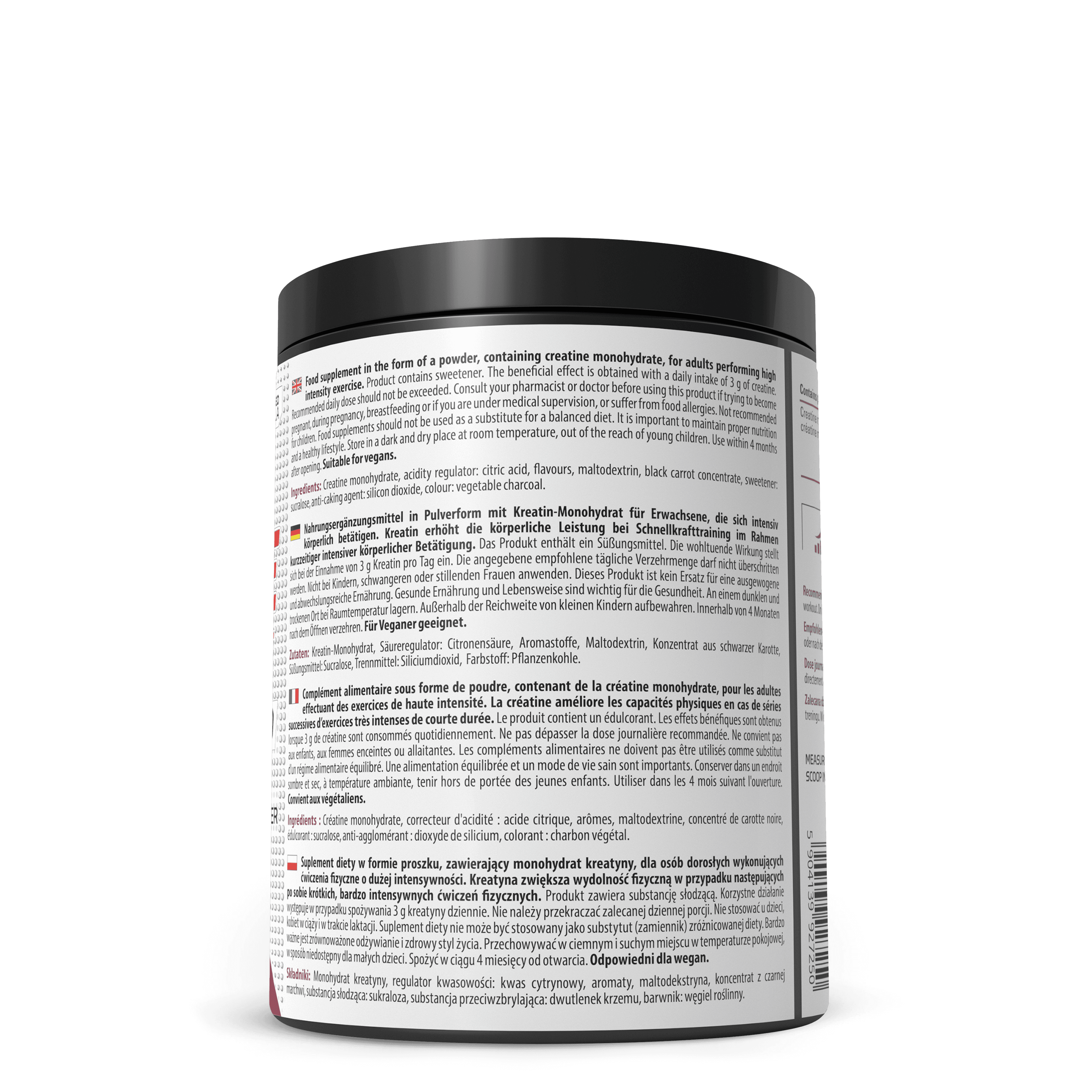 Créatine monohydrate, correcteur d'acidité : acide citrique, arômes, maltodextrine, concentré de carotte noire, édulcorant : sucralose, anti-agglomérant : dioxyde de silicium, colorant : charbon végétal.