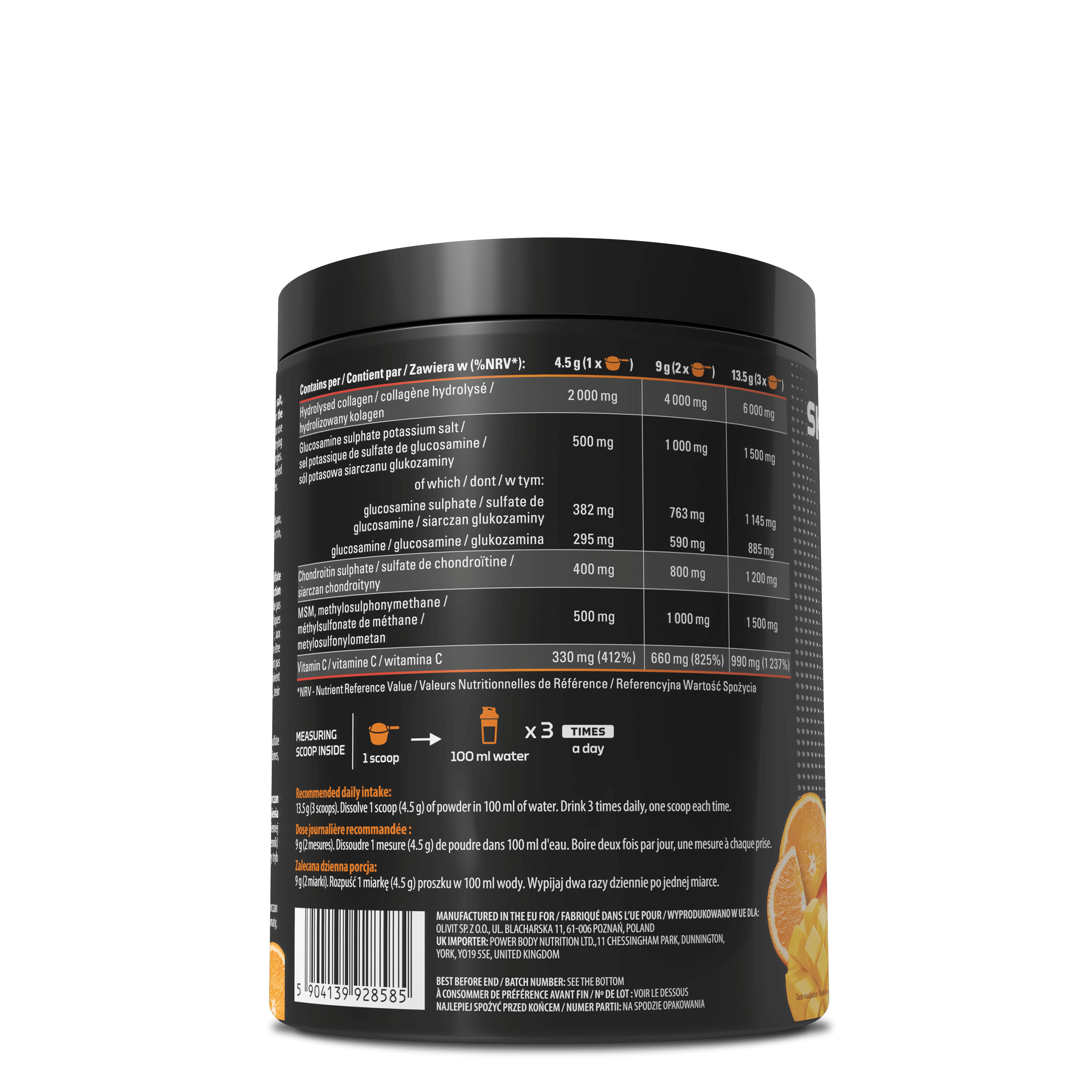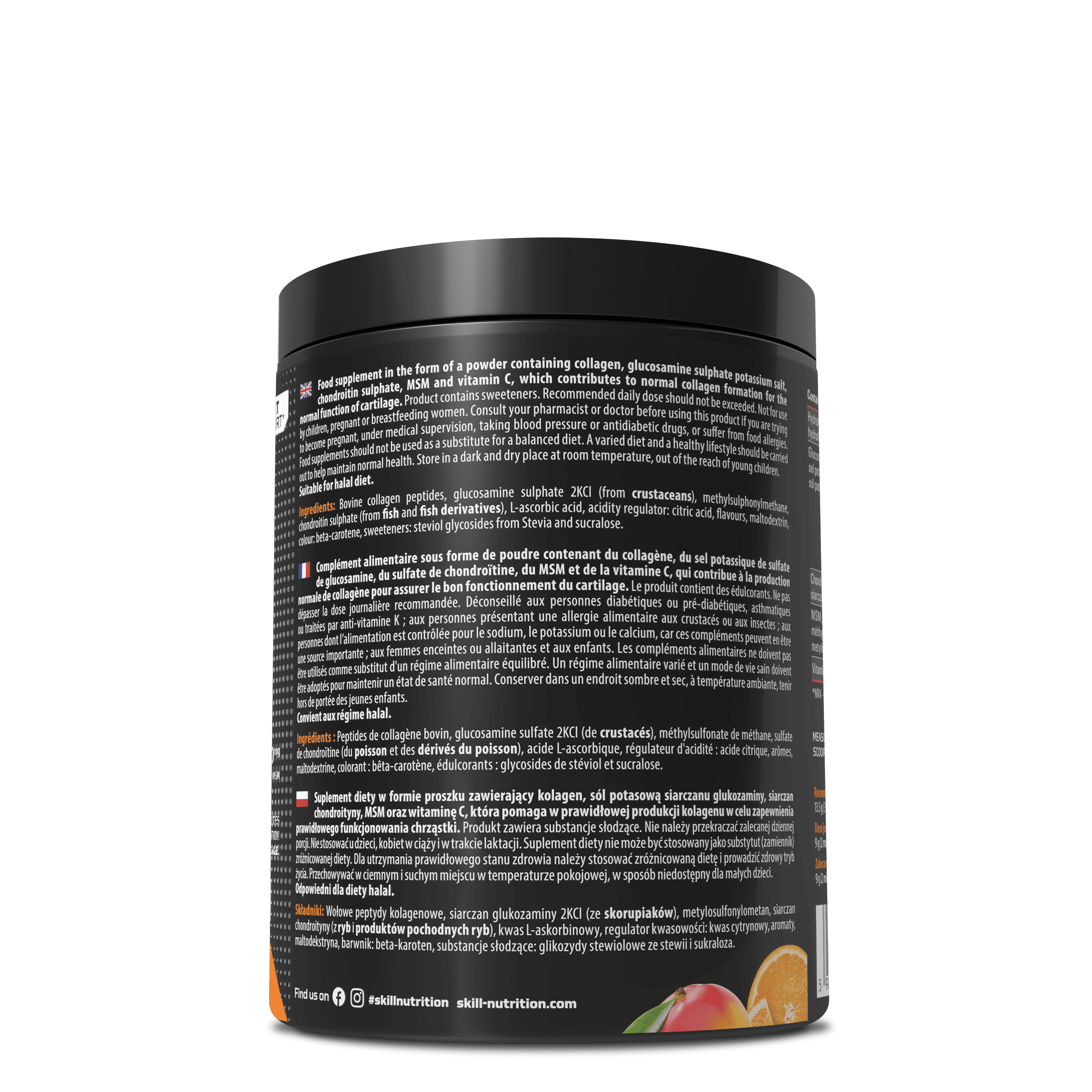 Complément alimentaire sous forme de poudre contenant du collagène, du sel potassique de sulfate de glucosamine, du sulfate de chondroïtine, du MSM et de la vitamine C, qui contribue à la production normale de collagène pour assurer le bon fonctionnement du cartilage. Le produit contient des édulcorants. Ne pas dépasser la dose journalière recommandée. Déconseillé aux personnes diabétiques ou pré-diabétiques, asthmatiques ou traitées par anti-vitamine K ; aux personnes présentant une allergie alimentaire aux crustacés ou aux insectes ; aux personnes dont l’alimentation est contrôlée pour le sodium, le potassium ou le calcium, car ces compléments peuvent en être une source importante ; aux femmes enceintes ou allaitantes et aux enfants. Les compléments alimentaires ne doivent pas être utilisés comme substitut d'un régime alimentaire équilibré. Un régime alimentaire varié et un mode de vie sain doivent être adoptés pour maintenir un état de santé normal. Conserver dans un endroit sombre et sec, à température ambiante, tenir hors de portée des jeunes enfants.
