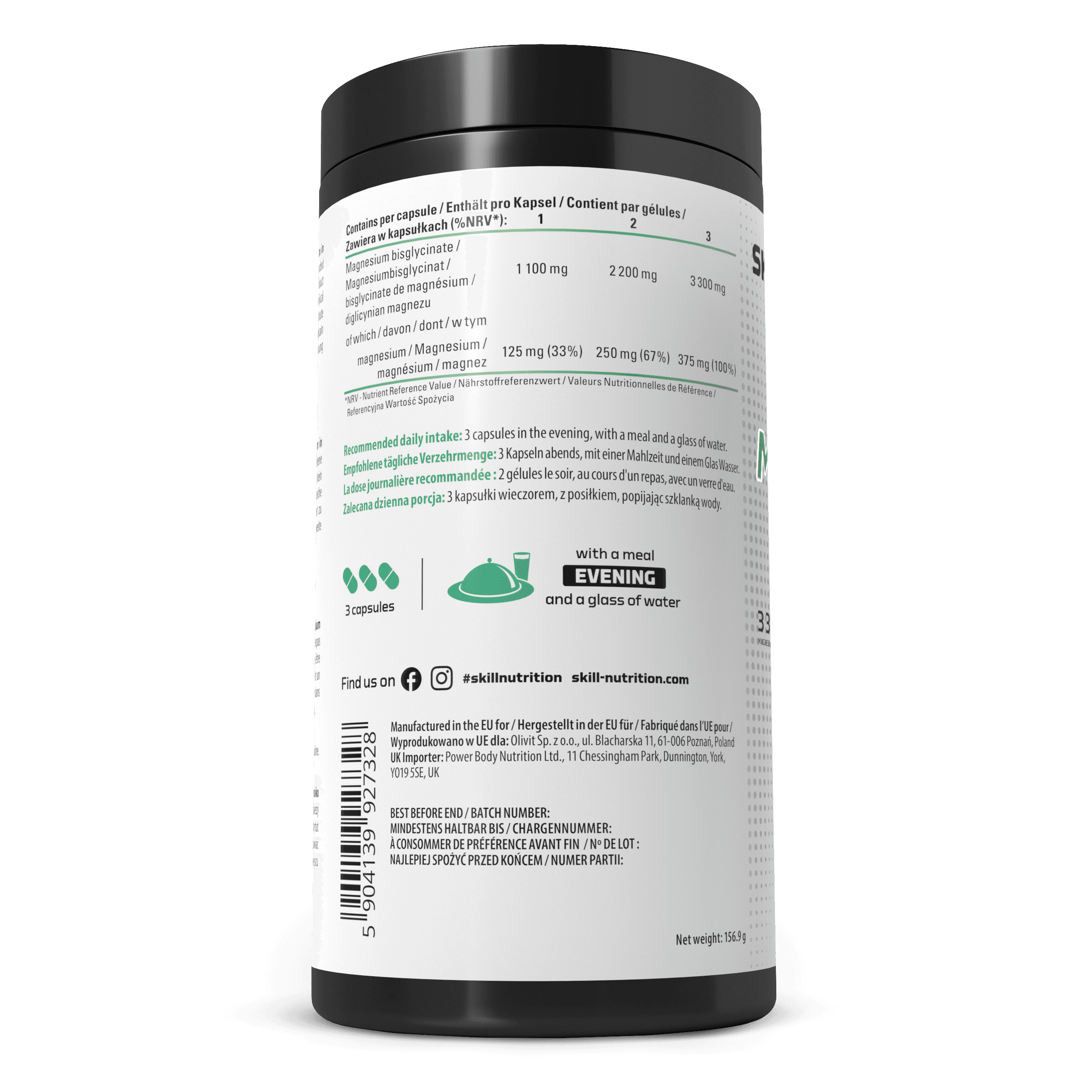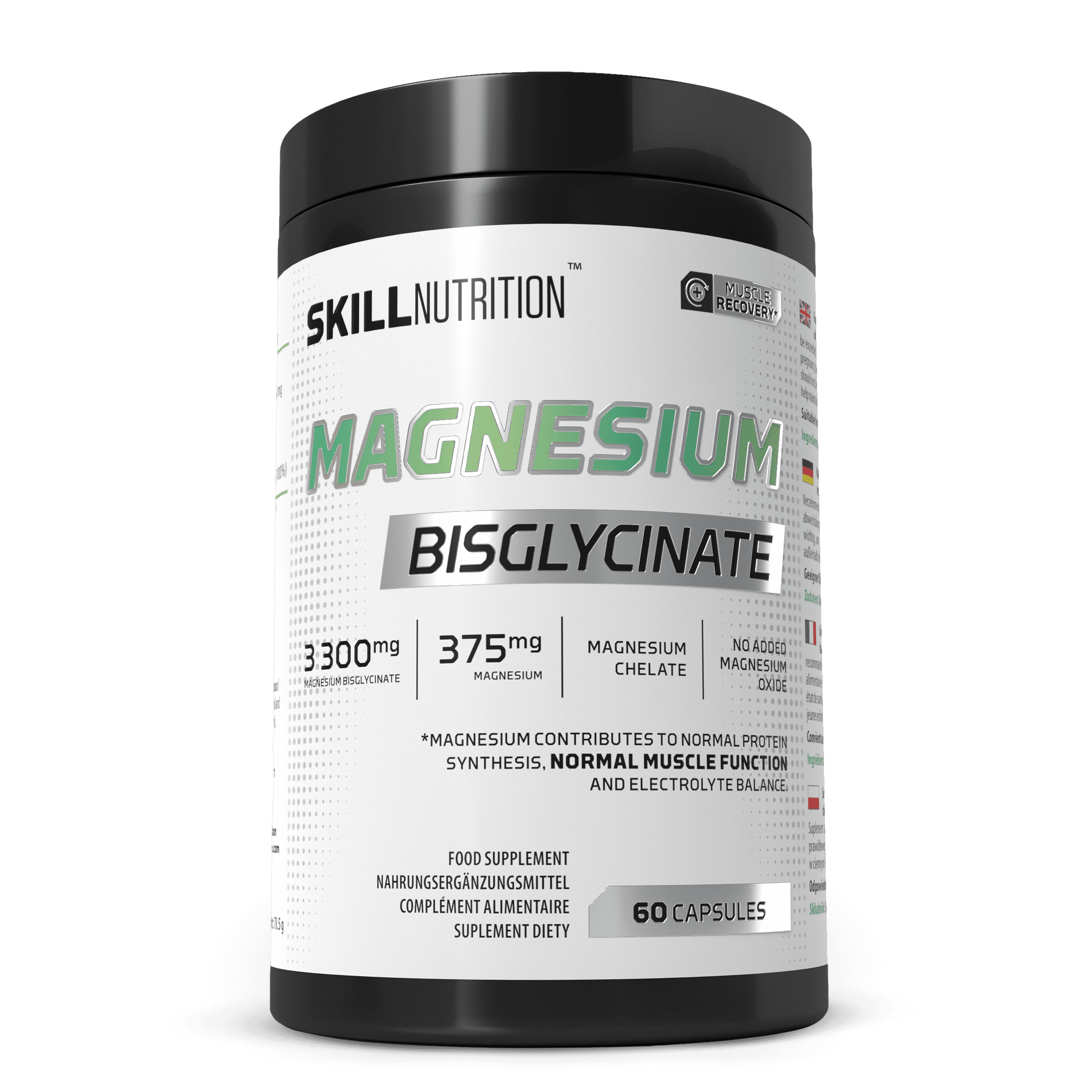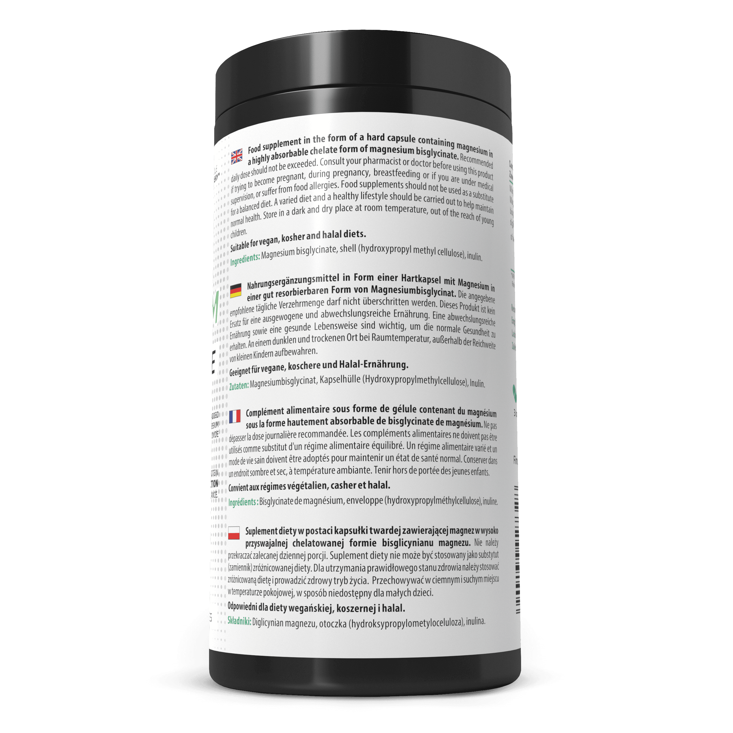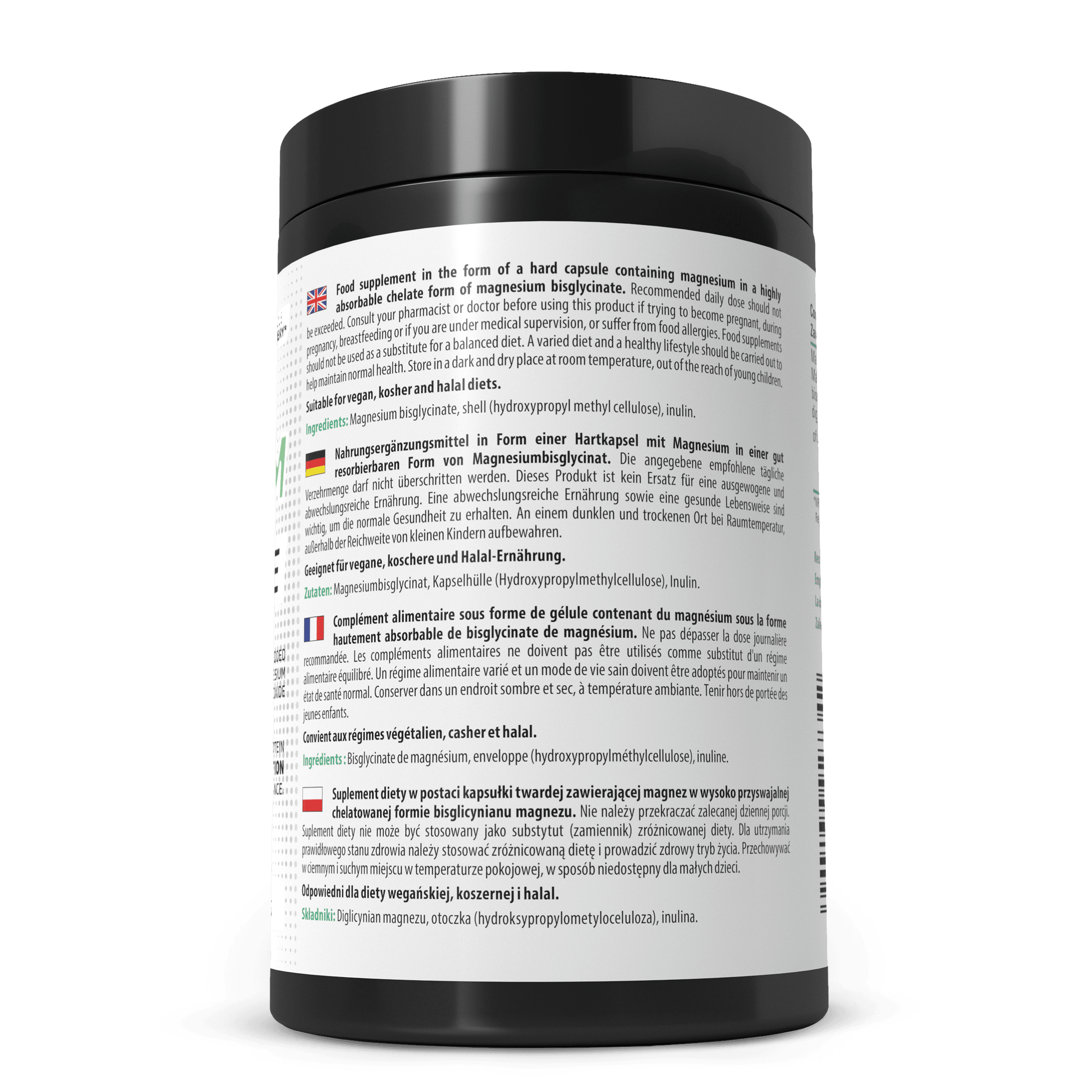 Complément alimentaire sous forme de gélule contenant du magnésium sous la forme hautement absorbable de bisglycinate de magnésium. Ne pas dépasser la dose journalière recommandée. Les compléments alimentaires ne doivent pas être utilisés comme substitut d'un régime alimentaire équilibré. Un régime alimentaire varié et un mode de vie sain doivent être adoptés pour maintenir un état de santé normal. Conserver dans un endroit sombre et sec, à température ambiante. Tenir hors de portée des jeunes enfants.