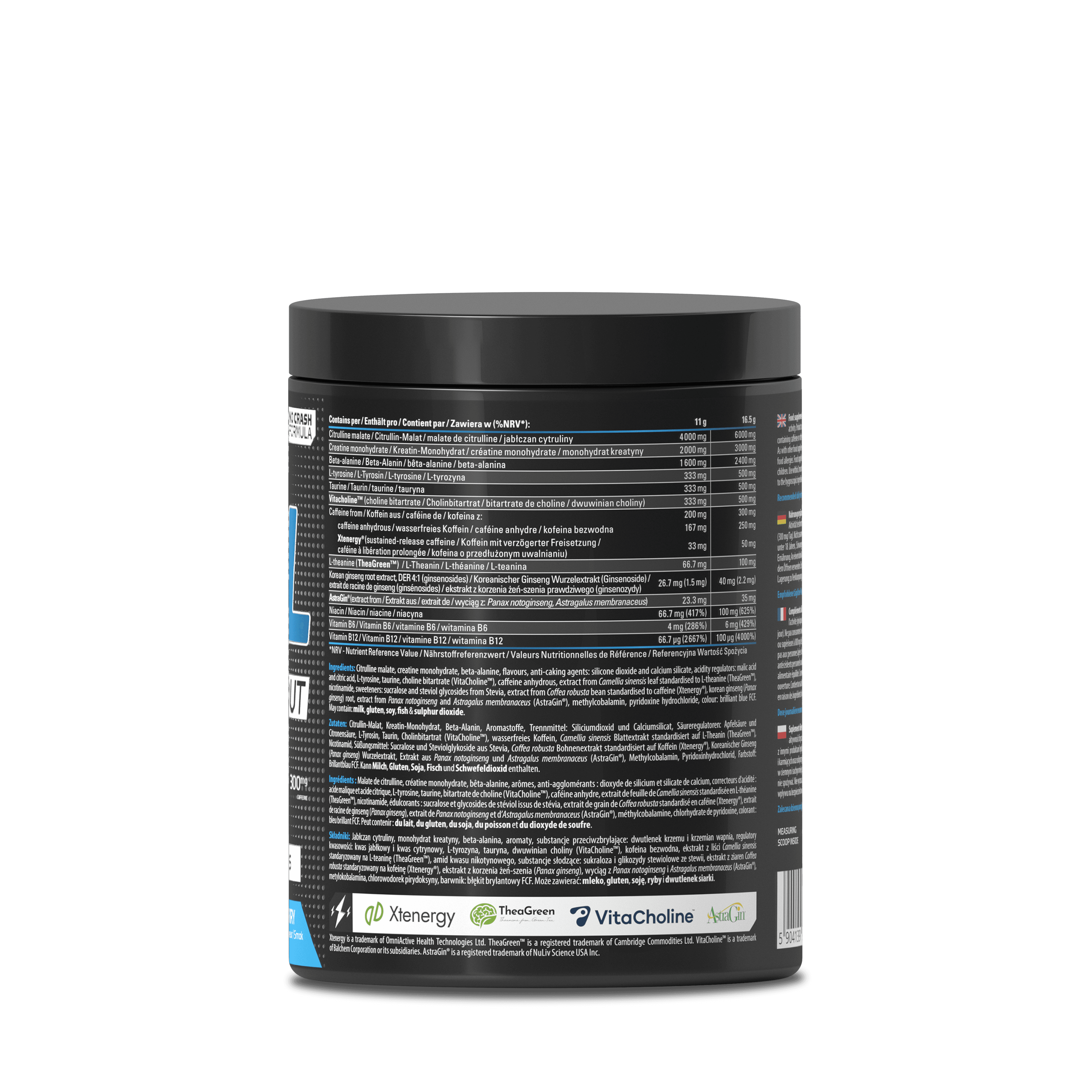 Malate de citrulline, créatine monohydrate, bêta-alanine, arômes, anti-agglomérants : dioxyde de silicium et silicate de calcium, correcteurs d'acidité : acide malique et acide citrique, L-tyrosine, taurine, bitartrate de choline (VitaCholine™), caféine anhydre, extrait de feuille de Camellia sinensis standardisée en L-théanine (TheaGreen™), nicotinamide, édulcorants : sucralose et glycosides de stéviol issus de stévia, extrait de grain de Coffea robusta standardisé en caféine (Xtenergy®), extrait de racine de ginseng (Panax ginseng), extrait de Panax notoginseng et d’Astragalus membranaceus (AstraGin®), méthylcobalamine, chlorhydrate de pyridoxine, colorant : bleu brillant FCF. Peut contenir : du lait, du gluten, du soja, du poisson et du dioxyde de soufre.