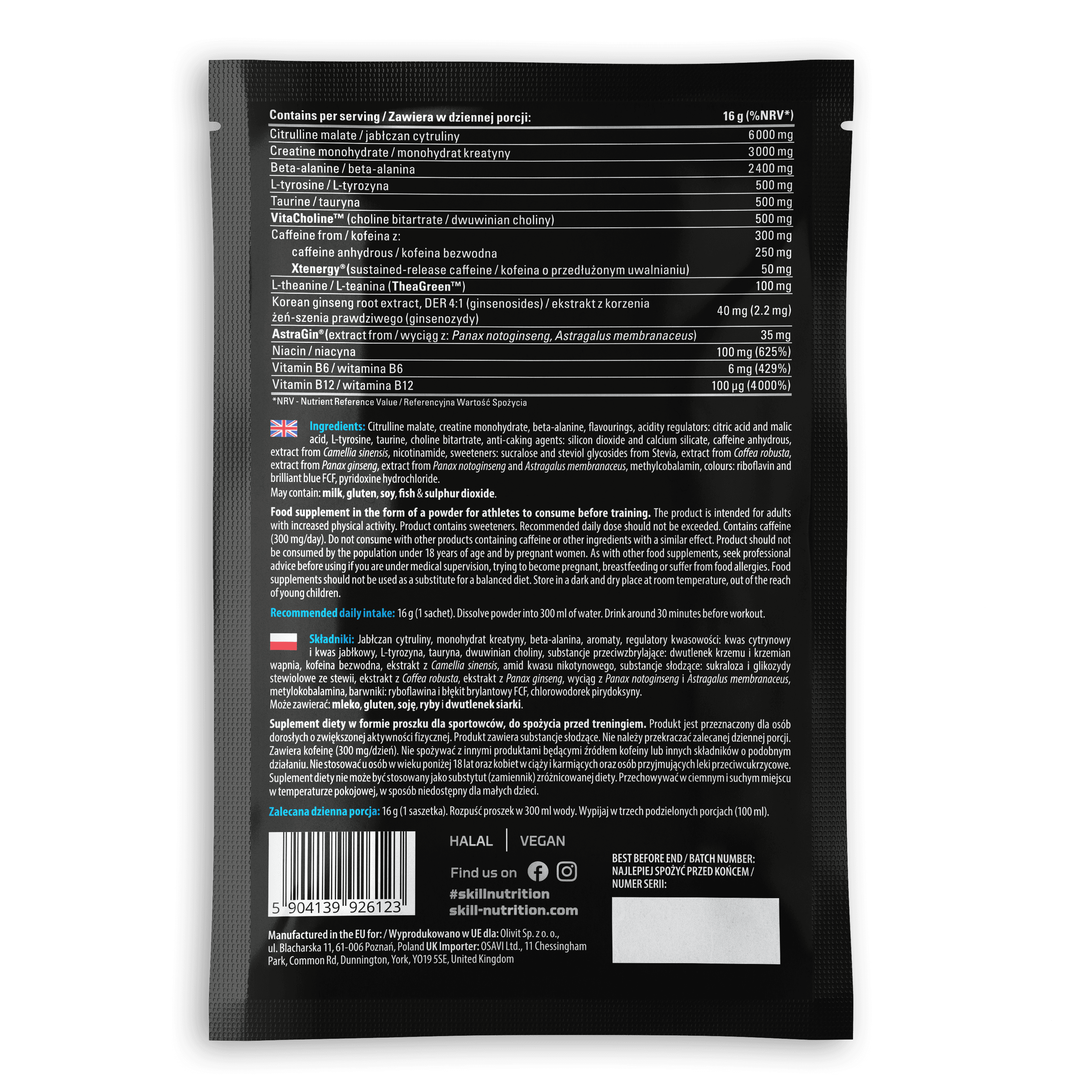 Complément alimentaire sous forme de poudre destiné aux sportifs à consommer avant l'entraînement. Le produit est destiné aux adultes dont l'activité physique est accrue. Le produit contient des édulcorants. La dose journalière recommandée ne doit pas être dépassée. Contient de la caféine (200 mg/jour). Ne pas consommer avec d'autres produits contenant de la caféine ou d'autres ingrédients ayant un effet similaire. Ne pas dépasser la consommation journalière égale ou supérieure à 800 mg de 3-gallate d’épigallocatéchine. Ne doit pas être consommé si vous prenez le même jour d’autres produits contenant du thé vert. Ne convient pas aux personnes âgées de moins de 18 ans, aux femmes enceintes et allaitantes et aux personnes sous traitement antidiabétique. Déconseillé aux femmes ayant des antécédents personnels ou familiaux de cancer du sein. Ne doit pas être consommé à jeun. Les compléments alimentaires ne doivent pas être utilisés comme substitut d'un régime alimentaire équilibré. Conserver dans un endroit sombre et sec, à température ambiante, hors de portée des jeunes enfants, ne pas jeter le sachet déshydratant. Si ce produit n'est pas stocké correctement, la poudre peut s'agglomérer en raison des ingrédients hygroscopiques. Cette agglomération n'affecte pas la sécurité ou la qualité du produit.