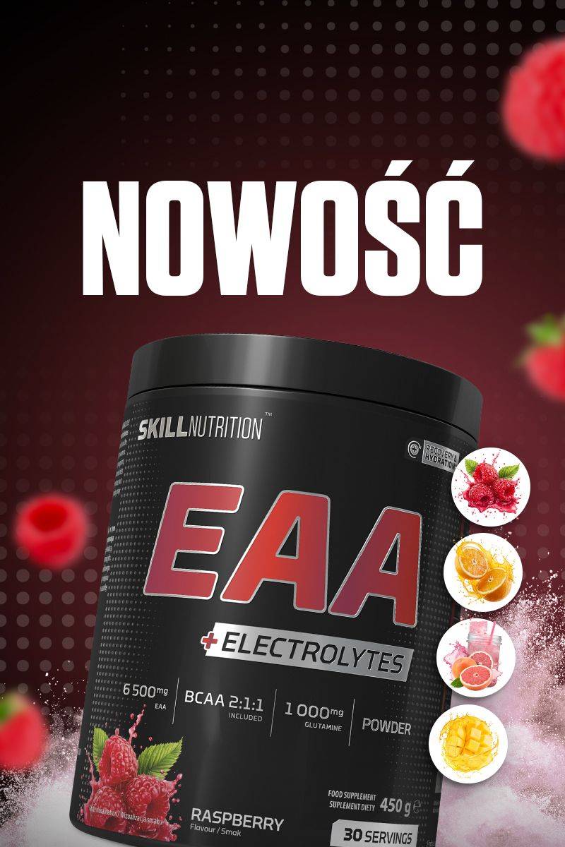 EAA + Electrolytes to suplement łączący niezbędne aminokwasy egzogenne i elektrolity, stworzony z myślą o osobach aktywnych na co dzień. Jedna porcja dostarcza 6,5 g EAA, w tym 3,8 g BCAA w proporcji 2:1:1, a uzupełnieniem składu jest 1000 mg L-glutaminy oraz opatentowany AstraGin®.