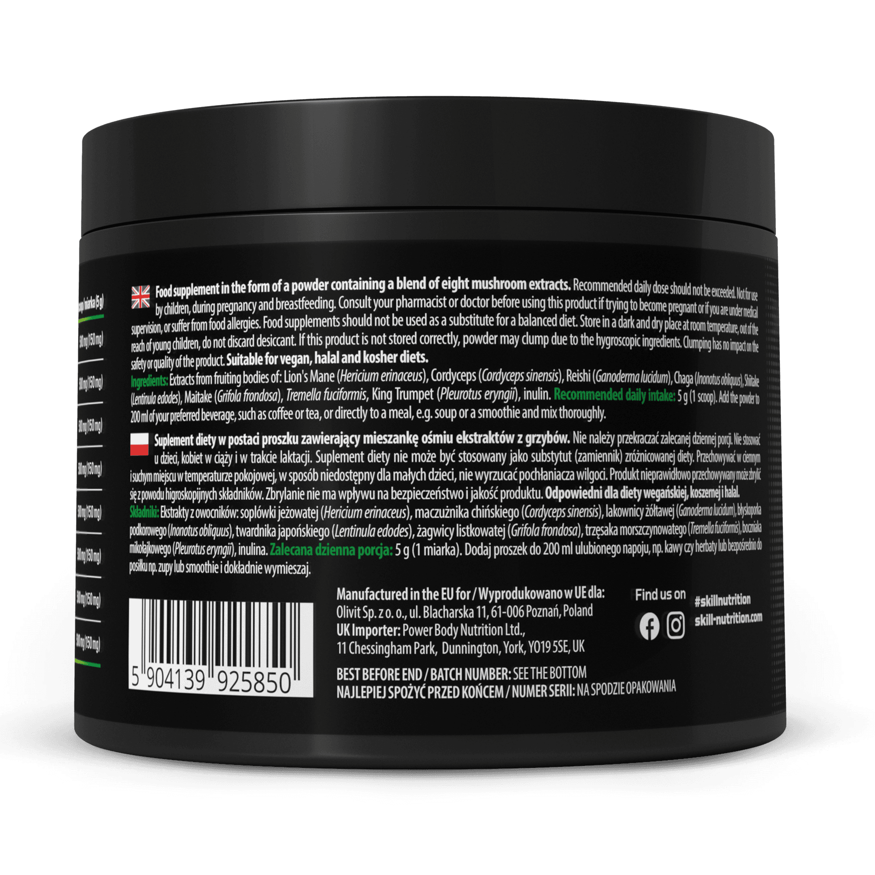 Suplement diety w postaci proszku zawierający mieszankę ośmiu ekstraktów z grzybów. Nie należy przekraczać zalecanej dziennej porcji. Nie stosować u dzieci, kobiet w ciąży i w trakcie laktacji. Suplement diety nie może być stosowany jako substytut (zamiennik) zróżnicowanej diety. Przechowywać w ciemnym i suchym miejscu w temperaturze pokojowej, w sposób niedostępny dla małych dzieci, nie wyrzucać pochłaniacza wilgoci. Produkt nieprawidłowo przechowywany może zbrylić się z powodu higroskopijnych składników. Zbrylanie nie ma wpływu na bezpieczeństwo i jakość produktu.