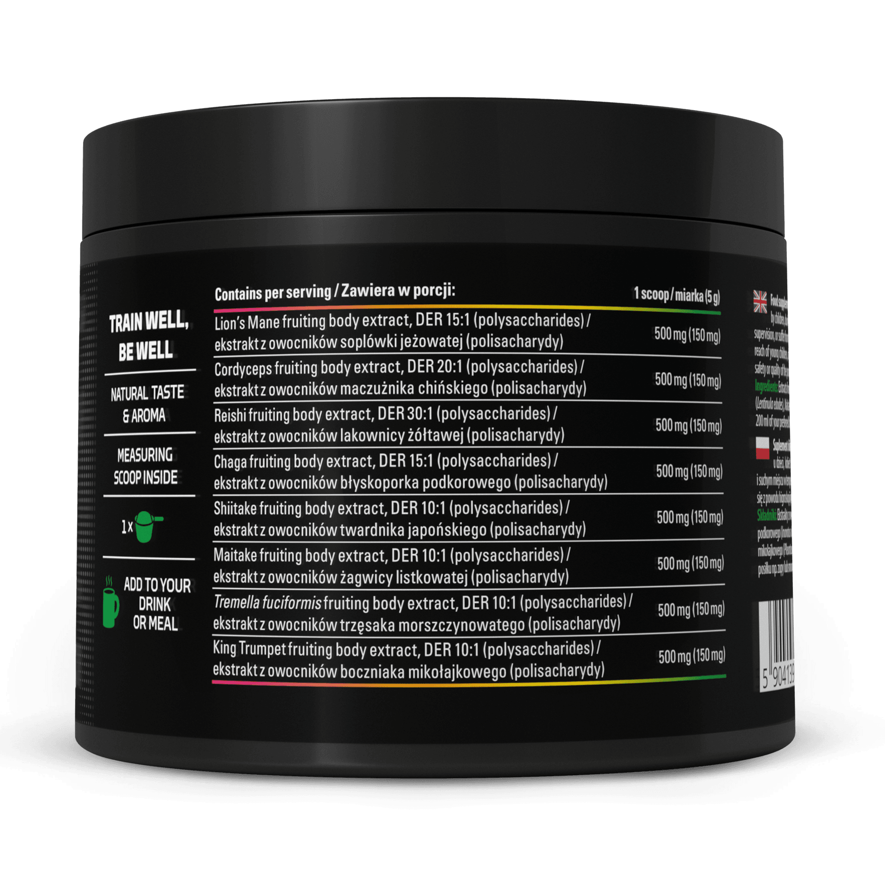 Zawiera ekstrakty z owocników soplówki jeżowatej (Lion's Mane, DER 15:1), maczużnika chińskiego (Cordyceps sinensis, DER 20:1), lakownicy żółtawej (Reishi, DER 30:1), błyskoporka podkorowego (Chaga, DER 15:1), twardnika japońskiego (Shiitake, DER 10:1), żagwicy listkowatej (Maitake, DER 10:1), trzęsaka morszczynowatego (Tremella fuciformis, DER 10:1) oraz boczniaka mikołajkowego (King Trumpet, DER 10:1).
