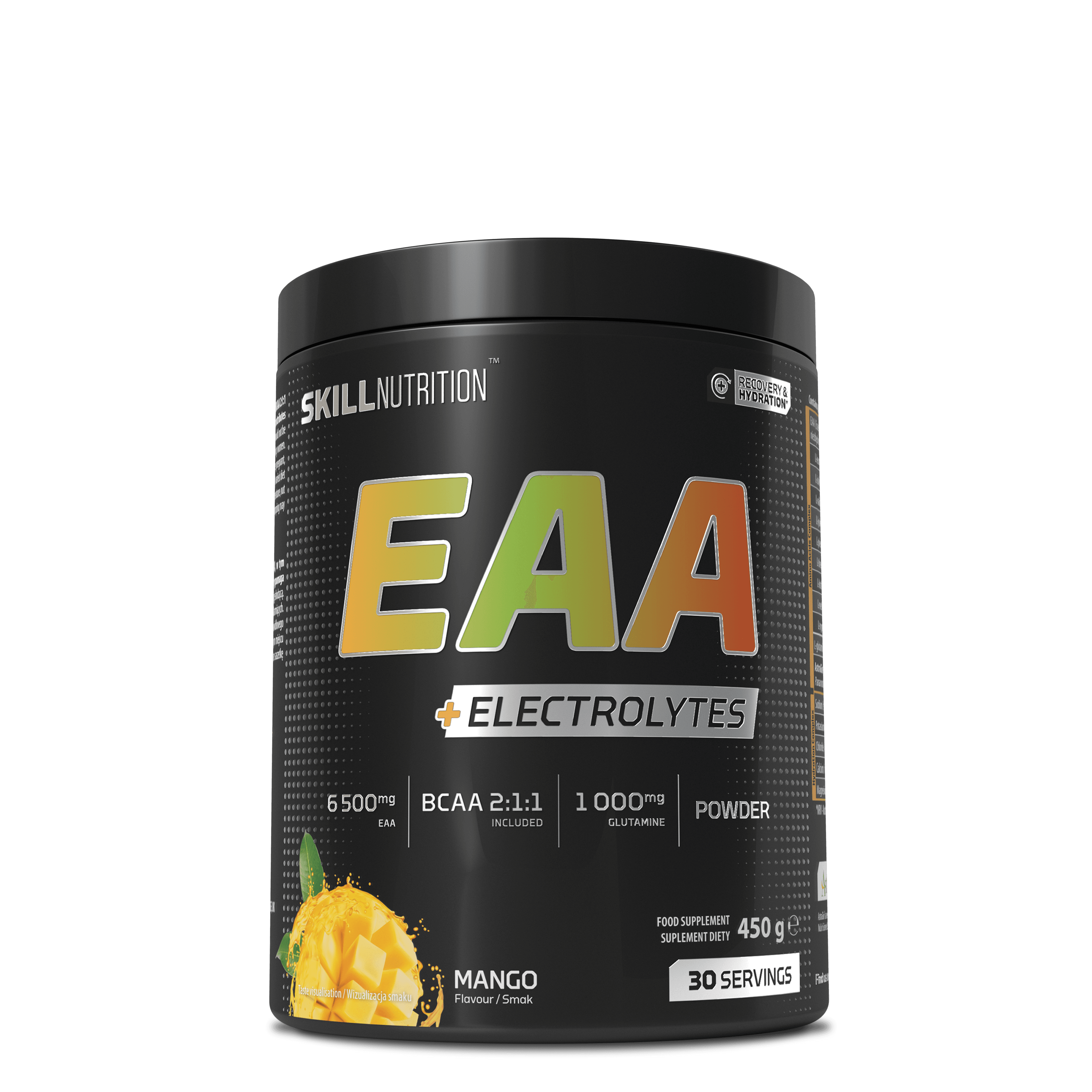 Suplement diety w formie proszku zawierający wszystkie 9 niezbędnych aminokwasów (EAA), w tym BCAA 2:1:1 (aminokwasy rozgałęzione), L-glutaminę, AstraGin® oraz elektrolity z *magnezem, który pomaga w prawidłowym funkcjonowaniu mięśni i utrzymaniu równowagi elektrolitowej. Produkt zawiera substancję słodzącą. Nie należy przekraczać zalecanej dziennej porcji. Nie stosować u osób w wieku poniżej 18 lat oraz kobiet w ciąży i karmiących. Suplement diety nie może być stosowany jako substytut (zamiennik) zróżnicowanej diety. Dla utrzymania prawidłowego stanu zdrowia należy stosować zróżnicowaną dietę i prowadzić zdrowy tryb życia. Przechowywać w ciemnym i suchym miejscu w temperaturze pokojowej, w sposób niedostępny dla małych dzieci. Spożyć w ciągu 2 miesięcy od otwarcia. Zawiera saszetkę osuszającą, nie spożywać. Naturalne zbrylanie może wystąpić; nie wpływa na bezpieczeństwo ani jakość produktu.