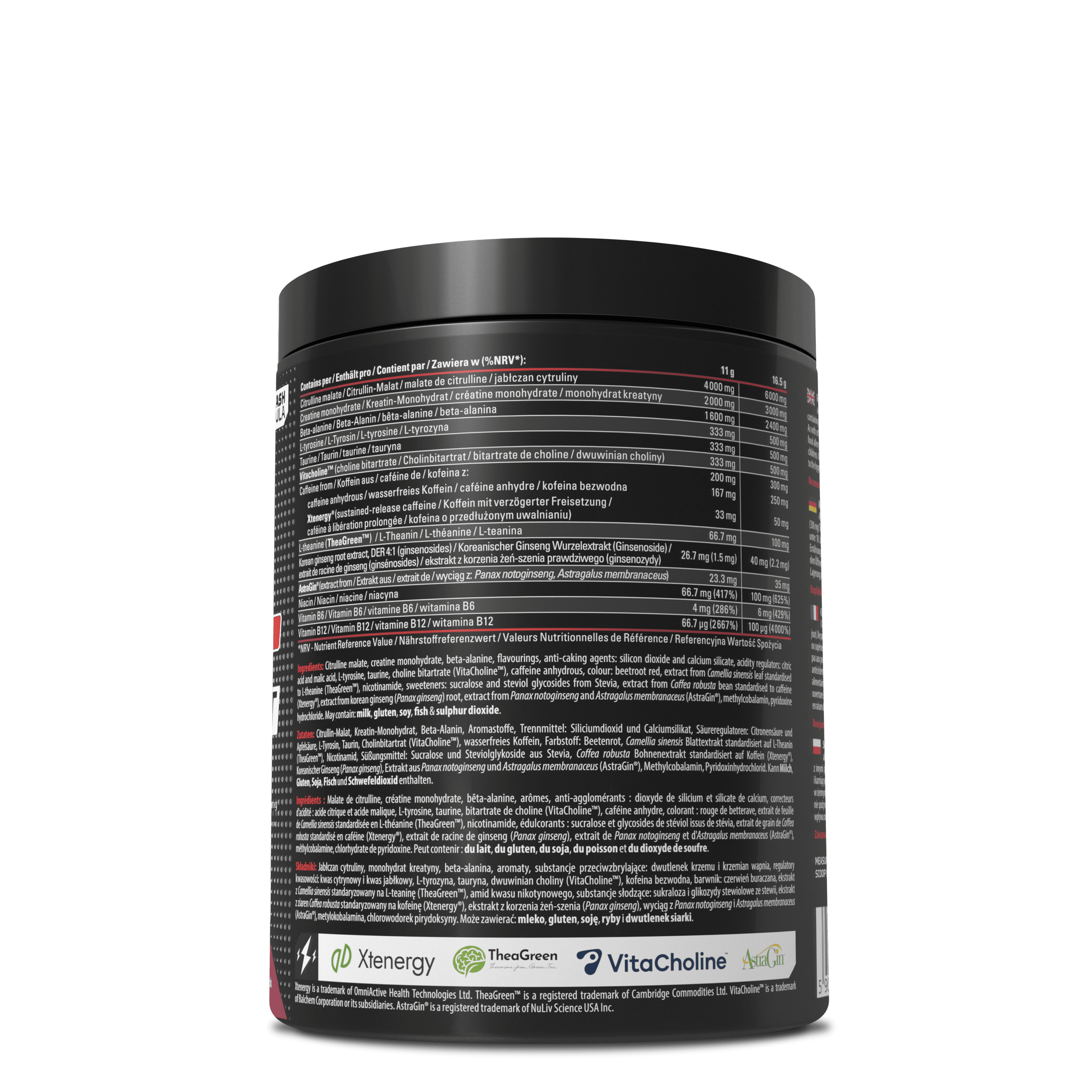 Jabłczan cytruliny, monohydrat kreatyny, beta-alanina, aromaty, substancje przeciwzbrylające: dwutlenek krzemu i krzemian wapnia, regulatory kwasowości: kwas cytrynowy i kwas jabłkowy, L-tyrozyna, tauryna, dwuwinian choliny (VitaCholine™), kofeina bezwodna, barwnik: czerwień buraczana, ekstrakt z Camellia sinensis standaryzowany na L-teaninę (TheaGreen™), amid kwasu nikotynowego, substancje słodzące: sukraloza i glikozydy stewiolowe ze stewii, ekstrakt z ziaren Coffea robusta standaryzowany na kofeinę (Xtenergy®), ekstrakt z korzenia żeń-szenia (Panax ginseng), wyciąg z Panax notoginseng i Astragalus membranaceus (AstraGin®), metylokobalamina, chlorowodorek pirydoksyny.
