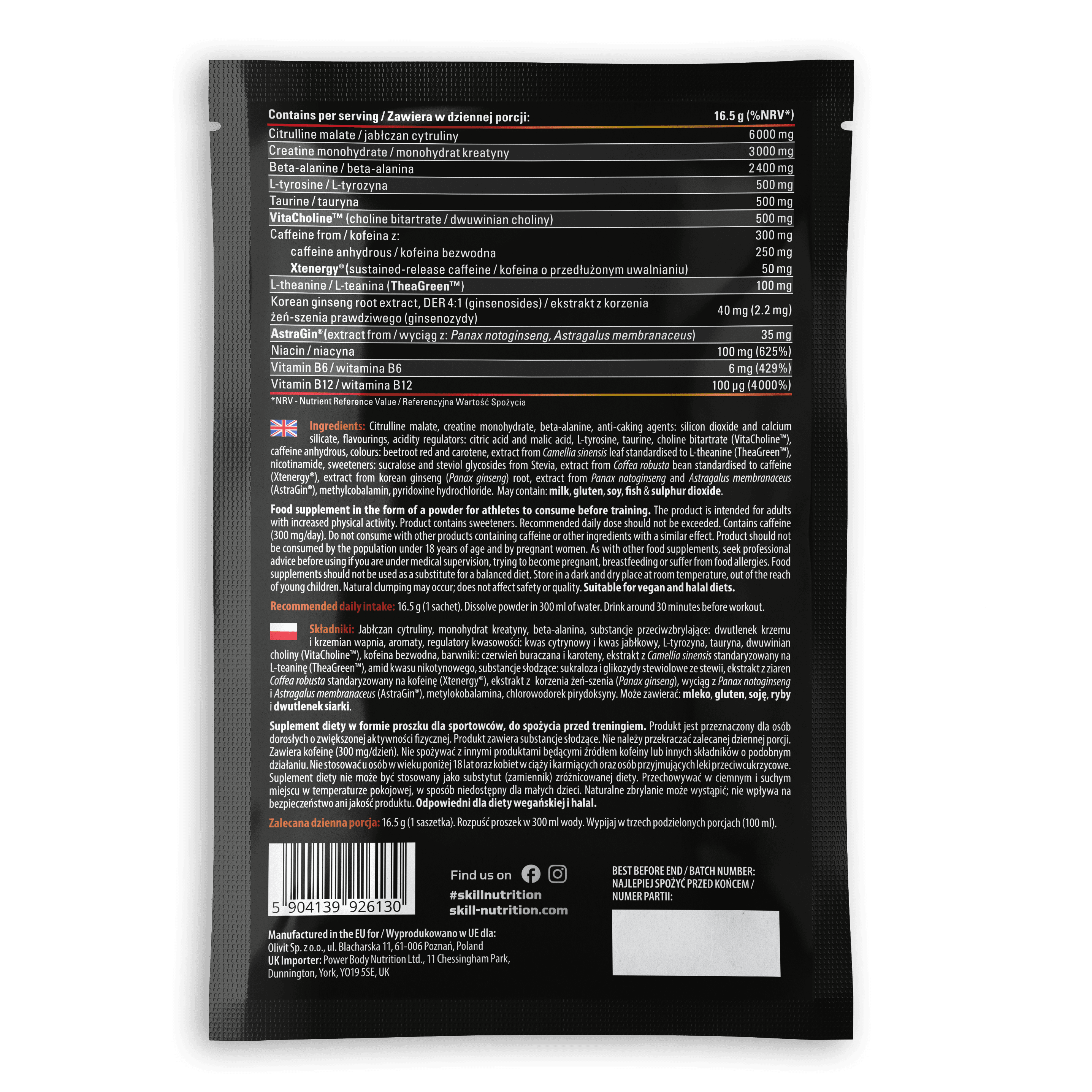 Składniki: Jabłczan cytruliny, monohydrat kreatyny, beta-alanina, substancje przeciwzbrylające: dwutlenek krzemu i krzemian wapnia, aromaty, regulatory kwasowości: kwas cytrynowy i kwas jabłkowy, L-tyrozyna, tauryna, dwuwinian choliny (VitaCholine™), kofeina bezwodna, barwniki: czerwień buraczana i karoteny, ekstrakt z Camellia sinensis standaryzowany na L-teaninę (TheaGreen™), amid kwasu nikotynowego, substancje słodzące: sukraloza i glikozydy stewiolowe ze stewii, ekstrakt z ziaren Coffea robusta standaryzowany na kofeinę (Xtenergy®), ekstrakt z korzenia żeń-szenia (Panax ginseng), wyciąg z Panax notoginseng i Astragalus membranaceus (AstraGin®), metylokobalamina, chlorowodorek pirydoksyny. Może zawierać: mleko, gluten, soję, ryby i dwutlenek siarki.